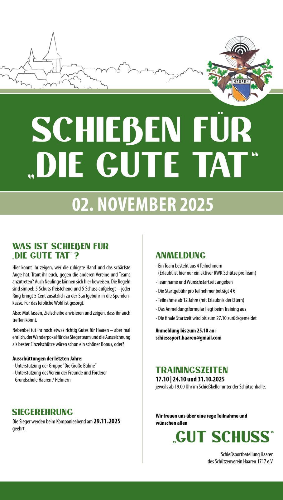 In unserer Jubiläum-Saison 2025/2026 nehmen teil: 1 Schülermannschaft freistehend, 14 bis 16 Jahre, 1 Schülermannschaft aufgelegt, 12 bis 14 Jahre, 1 Luftpistolenmannschaft ab 17 Jahren, 4 Altersschützen-Mannschaften aufgelegt, 40 bis 99 Jahre, 5 Schützenmannschaften, 22 bis 40 Jahre Eine Altersbegrenzung besteht nur bei dem Schüler und Jugendmannschaften. Alle anderen Schützen können über diese Lebensaltersgrenze hinaus in ihren Klassen verbleiben. Die Zugehörigkeit zur Altersklasse ist freiwillig und beginnt ab den 40. Lebensjahr. Ferner nimmt eine Kleinkaliber-Mannschaft an den Rundenwettkämpfen teil. Dafür fahren wir nach Essentho zum Großkaliberstand für unsere Heimwettkämpfen. Alle anderen KK-Wettkämpfe finden fast immer in Paderborn-Sande statt. So kommen wir in unserer Jubiläumssaison auf über 50 Teilnehmer. Wer Lust hat kann uns gerne Besuchen, im Schießkeller der Schützenhalle, immer dienstags ab 19.00 Uhr. Man kann mit Vereinsgewehren üben um zu sehen ob dieser Sport einen Spaß macht. |